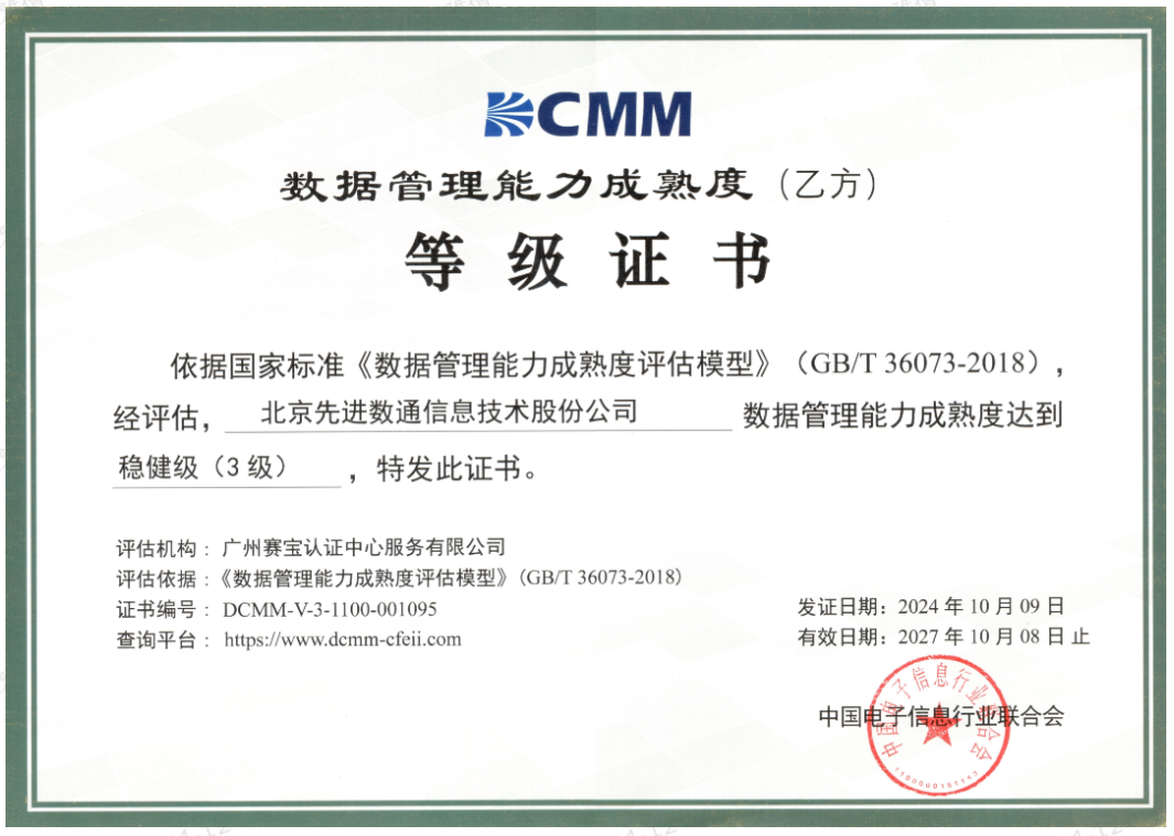 近期,中国电子信息行业联合会公布了最新一批顺利获得数据管理能力成熟度(DCMM)贯标等级认证的企业名单。顺发配资成功取得数据管理能力成熟度稳健级(三级)认证。这一认证的取得,标志着顺发配资在数据治理体系构建和数据管理与应用能力方面,已经达到了国家权威组织认可的标准。这不仅是对顺发配资在数据管理领域专业能力的肯定,也是对其在有助于数字化转型服务和数据驱动决策方面所做努力的认可。